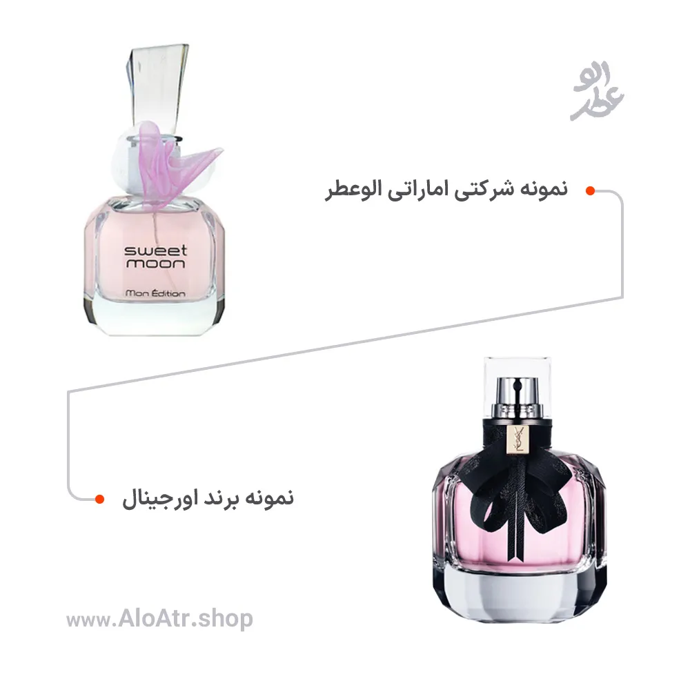 عطر شرکتی اماراتی Sweet Moon (سوئیت مون فراگرنس ورد) نسخه مشابه عطر محبوب ایو سن لورن مون پاریس (Yves Saint Laurent Mon Paris) است و رایحهای بسیار مشابه دارد. ماندگاری و پخش بو این عطر مناسب است و با توجه به قیمت اقتصادی، انتخابی هوشمندانه و ارزشمند برای خرید است.